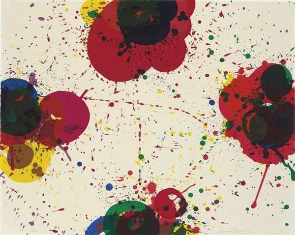 Curator: The piece before us, created in 1963, is titled "Untitled (from Pasadena Box)." It’s an acrylic print by the American artist Sam Francis. Editor: My immediate impression is of organized chaos! The colors are vivid—cobalt blue, rust-orange, lemon-yellow—splayed across the surface in dynamic, organic forms. The composition seems deliberately unbalanced. Curator: Francis emerged during a period dominated by Abstract Expressionism, so its rejection of representational forms makes sense. He situated himself amongst New York artists responding to anxieties of the atomic age by turning to the visceral act of painting itself. Editor: Right, I can certainly see that, with its all-over composition. Notice the interplay of shapes—those amorphous blobs and splatters. It looks like cells seen through a microscope slide, simultaneously contained and expanding outward, almost like an otherworldly form. The contrast in textures – thin drips versus thick impasto-like pools of color – lends a tactile quality. Curator: Consider the significance of calling it the “Pasadena Box”. In 1962, Walter Hopps organized the famous Marcel Duchamp retrospective at the Pasadena Art Museum. Francis may have been interested in making something reproducible and available in a relatively accessible way, perhaps in line with Duchamp's idea that the museum had been bypassed by artists themselves who could create new avenues for distributing artwork and undermining authority. Editor: And that sense of the process itself being on display. It emphasizes the materiality of paint and the action of applying it to a surface—the gesture becomes the subject. It seems more process oriented, a deliberate investigation of color interaction. Curator: Francis also grappled with existential themes after his health problems, which, to some extent, also appear to manifest here. Although a dynamic, it's somehow melancholic and hints at themes of life, death, and regeneration. Editor: Yes, you are so right, I did miss that slightly. Those seemingly random marks aren't random at all when you know the context of production and start associating them with certain universal experiences, of birth and pain. I notice something different. Curator: This deep dive reveals how even seemingly "pure" abstraction has profound cultural and personal connections, shaped by larger historical currents. Editor: It underscores how formal analysis alone isn’t enough to grasp the fullness of the artwork. And seeing art always in relation to its context helps create new understandings.