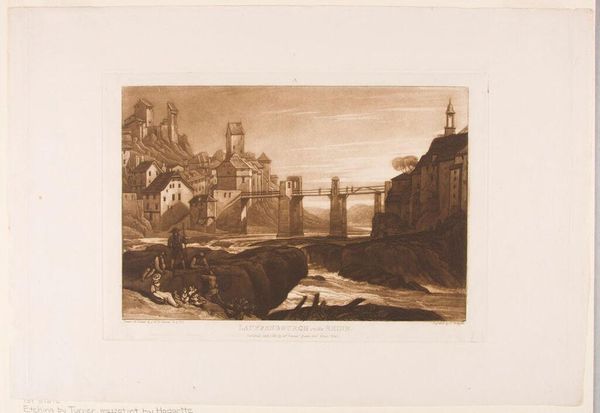 This print, ‘Lauffenbourgh on the Rhine,’ was made by J.M.W. Turner, part of his ‘Liber Studiorum’ series using etching and mezzotint. These processes involve covering a metal plate with wax, drawing into it to expose the metal, and then bathing the plate in acid. This creates incised lines that hold ink. Mezzotint uses a tool to create a rough surface, allowing for rich tonal effects. The resulting print is dominated by the scene’s architecture and cascading river, both rendered in exquisite detail. Look closely, and you can see the texture of the stone and the movement of the water, achieved through the meticulous, labor-intensive process of etching and mezzotint. In Turner's time, printmaking was a key means of circulating images, democratizing art for a wider audience. This print, with its complex techniques, shows a tension between artistic expression and commercial production. The ‘Liber Studiorum’ aimed to elevate landscape art, yet relied on industrial methods of reproduction. By understanding this interplay of materials, techniques, and social context, we gain a richer appreciation of Turner’s vision.