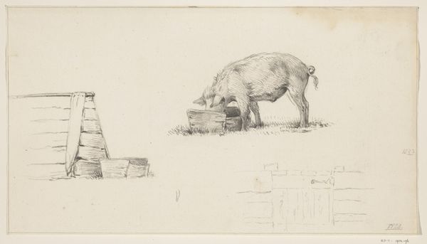 Curator: This intriguing sketch, titled "Zwei Ochsen neben einem Karren"—"Two Oxen Beside a Cart"—is attributed to Friedrich Wilhelm Hirt. Editor: My first thought is one of pastoral fatigue. There's a weariness captured in the slump of the ox closest to us. The sketch itself, its fragility, amplifies that feeling. Curator: Indeed. Hirt uses the subtlety of pencil, chalk, and graphite to define not just form, but texture. Note the meticulous detailing on the cart's structure contrasting with the looser rendering of the animals' musculature. The cart and the animals both exhibit texture from hatching with layered graphite and pencil lines. Editor: For me, oxen have always symbolized patient labor, and that connection is reinforced here. They appear subdued, almost melancholic. Perhaps they represent a deeper symbol of man's relationship to nature: the endless cycle of toil. This cycle of the beast harnessed in support of man also hints at a much earlier period. Curator: An interesting observation! Consider also the formal placement of the cart. Centered, yet somewhat fading, drawing our eye instead to the beasts. A compositional tension, perhaps hinting at the waning importance of traditional agrarian life during that period? Editor: Perhaps, or perhaps it’s the suggestion of quiet dignity amidst inevitable burden. There’s a vulnerability here; you can feel their very bones beneath the sketchwork. A timeless representation. Curator: Ultimately, Hirt has composed a poignant representation using minimal forms, a powerful statement on nature and labour. The interplay of light and shadow in this study breathes a somber awareness. Editor: I concur, an image pregnant with subdued sentiment. The ox forever burdened by work for man.
