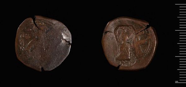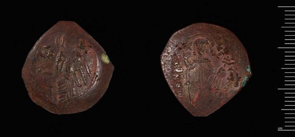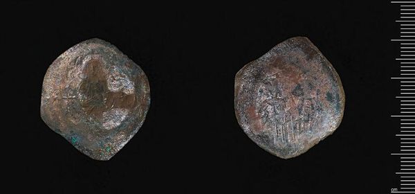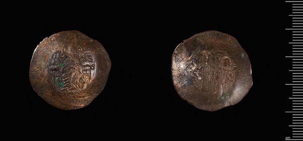 Editor: Here we have a coin of Isaac II. It's a small, dark, and worn piece of metal. What can you tell me about the making of this coin? Curator: Considering its materiality, we can ask about the labor involved in its production. Who mined the metal, and how did their work contribute to the economy and power structures of the time? Editor: So, it's about more than just the coin itself. Curator: Exactly. We should examine the social and economic context surrounding its creation and use. The wear indicates its use and circulation, thus giving it a place in the flow of goods and services. Editor: It makes me think about value and exchange in a completely new way. Curator: Indeed. The coin transcends its monetary value, becoming a symbol of power, labor, and the circulation of resources within a society.