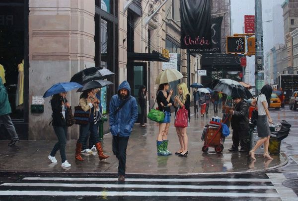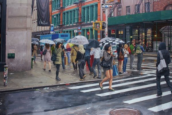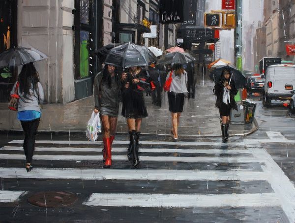 Vincent Giarrano’s “Women in Black” presents us with two women walking along a city street. The painting, a contemporary realist work, invites us to consider how women navigate urban spaces. In its composition, the painting directs our gaze to the backs of the figures, encouraging us to speculate about their lives and experiences. Their matching outfits and hairstyles, as well as the way they carry themselves, might be seen as an assertion of identity, a silent commentary on social expectations and the performance of femininity. The painting can be considered within the context of women's evolving roles in society and the nuanced ways in which they present themselves to the world. It invites viewers to reflect on the complexities of identity, the unspoken rules that govern social interactions, and the silent narratives that unfold on city streets every day.