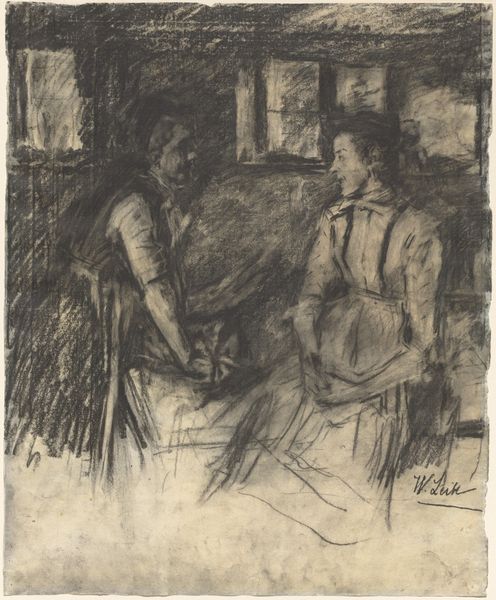 Curator: Look at this lovely charcoal and pencil drawing by Pierre-Auguste Renoir, dating back to 1881. It's titled "The Descent from the Summit: Jean Martin Steadies Hélène, the Banker’s Daughter." Editor: Ah, yes, I see her, the banker's daughter, looking slightly winded, perhaps even annoyed at being helped. It’s all in the posture, isn’t it? That little pout, the way she holds her skirts… the perils of high society in heels, eh? Curator: Exactly! It’s intriguing to think about the social dynamics at play here. The work was actually created as an illustration for a story called "L'étiquette," suggesting Renoir was very attuned to societal expectations. Consider the labor invested in those garments, rendered so delicately with the pencil work. This reveals a culture of very specific production. Editor: Indeed. And Renoir really captures the texture of the fabric with such simple strokes, doesn't he? It makes me wonder about the setting, too. Are they truly descending from a summit, or is this a more metaphorical fall from grace, played out on the grounds of some bourgeois estate? Curator: It's possible to read it both ways, especially when we factor in that this was also made as a page for a collection of drawings, likely made for viewing and appreciation by a collector who understood the relationship between capital and art making. These drawings, seemingly small, became the means to a broader project for Renoir. Editor: It feels incomplete though, doesn't it? More a whisper of a narrative than a full blown story. A charcoal sonnet, if you will, filled with light and shadow, suggestion and innuendo. I think Renoir revels in the lack of completion. Curator: Well said. And the fact that it's a drawing, rather than a finished painting, allows us to really focus on Renoir's process, the means of production, you could say, stripping away some of the artifice often associated with high art. He is working with simple materials, elevated by his craft. Editor: In the end, that’s all that matters: the crafting and the means of production and consumption of art. Curator: Yes, there's a definite blurring of the lines between high art and the materials from which art emerges in a culture itself. It's wonderful how this drawing manages to evoke such rich textures using minimal materials. Editor: Absolutely. Each element adds something profound. It's that strange intersection of narrative, the economy, production, materials and personal touch that truly brings an artwork to life, isn’t it?