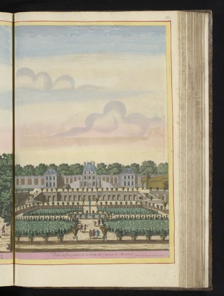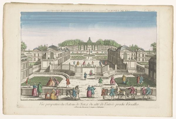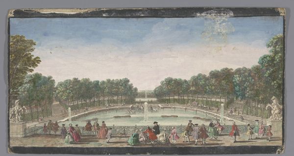 Editor: This is "View of the Garden of the Palacio Real de La Granja de San Ildefonso near the City of Madrid," an 18th-century watercolor painting. It feels very ordered and precise, like a stage set almost. What do you see in this piece, from a symbolic perspective? Curator: The layout itself—geometric, with meticulously placed figures—speaks to a desire for control over nature, mirroring a societal order. What do you think the garden itself might have represented? Editor: Power? The ability to command resources and manpower to create such a structured space? Curator: Precisely! The Palacio Real's garden is not just a pleasing visual; it is a cultural artifact, reflecting absolutist ideals. Do you see how the figures are positioned within the garden’s framework? Editor: They are so small and evenly spaced, they could be architectural features of the garden themselves, like the bushes. Curator: Exactly. The artist cleverly diminishes their individual importance, positioning them within the greater scheme, further emphasizing the absolute power of the monarchy and societal hierarchy of the era. The ordered arrangement mirrors the symbolic significance of landscape during that time. And the cityscape in the backdrop? Editor: An extension of this domain? I now see the connection, it goes well beyond just documenting the grounds; it uses cultural symbolism to emphasize power and societal order. Curator: It is all about orchestrated messaging! Reflecting on it, what strikes you most now about its cultural and visual language? Editor: How something seemingly decorative and pleasant on the surface can be laden with intentional visual symbolism relating to political power and control.