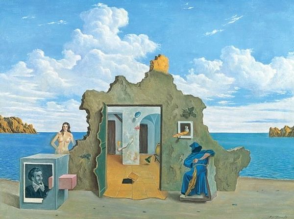 Curator: Let's turn our attention to "Enigma i calma sobre el mar," or "Enigma and Calm on the Sea," created in 1972 by Àngel Planells. What strikes you initially about this piece? Editor: There's an unnerving quietude. Despite the bizarre juxtapositions, or maybe because of them, a feeling of poised expectation permeates everything. The stillness feels charged. Curator: Exactly! Consider how Planells combines meticulous painting techniques with Surrealist imagery. His process involves a seamless merging of recognizable forms with dreamlike incongruities. It’s painting, undoubtedly, but also a stage set of the mind. Editor: The woman in the red dress, perched precariously – her very posture, almost a refusal to meet our gaze. What does she signify to you? This refusal is echoed by other headless figures in the scene; where they're replaced with either pottery or a rock formation! It's dream logic, clearly! Curator: Yes, it invites decoding. The woman's isolation reflects perhaps Planells' wider social context of isolation from mainstream Catalan art. The figures' partial visibility mirrors the restricted conditions for creativity during the period when Franco ruled in Spain. There were strict censorship practices. These figures exist only partially to exist without risk! Editor: Fascinating. It's intriguing how that chess piece just lurks behind the building facade! Chess, of course, a potent symbol for strategy and predetermined actions! Do you suppose Planells invites viewers to perceive figures caught in strategic games without full freedom? Curator: Indeed. And, by using meticulous realism, Planells elevates this dream logic with a palpable sense of reality and conviction. He transforms his concerns regarding freedom of thought and creativity into something visible for all. Editor: It's a visual poem—heavy with symbolism, provoking a sense of unease—as you rightly pointed out, linked directly to the making conditions within Spanish culture. I'll be pondering that image of a stage play for days! Curator: Likewise. Planells encourages to consider the interplay of materials, techniques, symbolism, and sociopolitical awareness in the painting tradition! A dense work.