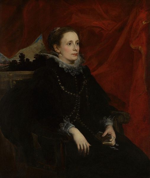 Jan Matejko painted this portrait of Katarzyna Potocka, née Branicka. The somber palette, dominated by blacks and dark hues, immediately strikes the eye and creates a solemn mood. The sitter's dark dress and head covering blend into the background, contrasting with the open book in her hands and the fabric on the table to the side. This portrait is more than just a likeness; it's a carefully constructed representation of social standing and personal identity through visual signs. The detailed rendering of textures, from the velvet of the chair to the delicate lace, speaks to Matejko's technical skill and the subject's wealth. The book, with its ornately decorated pages, is both an attribute of erudition and a symbol, inviting us to consider the intellectual and cultural values associated with the sitter. Note how each element functions as a signifier within a larger cultural code, reflecting broader artistic and philosophical concerns. The artist challenges fixed meanings and engages with ways of thinking about representation.