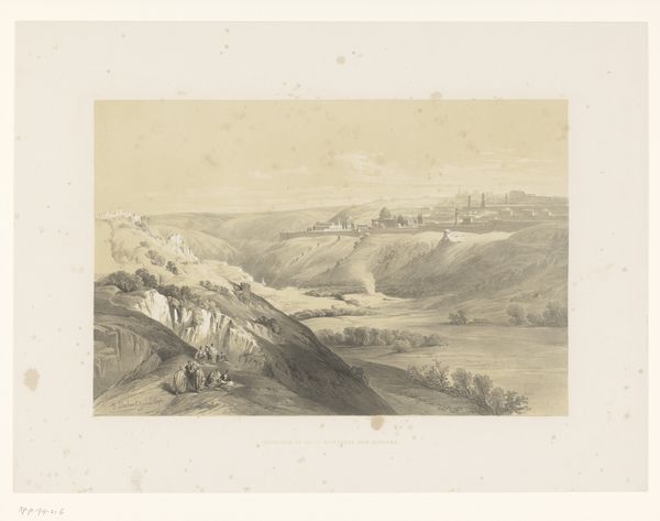 Editor: This etching, "View of Lake Tiberias," made by François Stroobant in 1852, evokes a quiet sense of distance. The subtle gradations in tone create a hazy, almost dreamlike atmosphere. How does the process of etching influence the reading of this landscape, in your opinion? Curator: Considering its creation date, mid-19th century, what raw materials were readily available for Stroobant? Copper plates were a valuable commodity, affected by trade routes. The very act of etching, biting into metal with acid, transforms landscape into a commodity. The social context, who commissioned or bought such prints, shapes our understanding. Who might be consuming landscape imagery? Editor: So, you're suggesting the choice of etching itself speaks to more than just aesthetic preference? Curator: Precisely. Consider the labor involved, the access to specialized knowledge required for etching. The print becomes a simulacrum of place, a reproducible image accessible to a certain class of consumers who would purchase the imagery as art for decorative purposes. Can this print offer insights into broader industrial processes of the era? Editor: It makes me think about the contrast between the serene landscape and the intensive labor that went into its production. Was the average person concerned with the social origins or labor related to creating works like this one? Curator: Often the labour of women or members of poorer working classes in factories or working at home creating materials was out of sight of middle classes purchasing work such as this, even though the item's value stemmed from that labor. Editor: It’s a reminder that even the most idyllic images have a material history deeply intertwined with economic and social forces. Thanks for making me see beyond the surface. Curator: And it highlights how artistic choices, like printmaking, have social and economic implications beyond their immediate aesthetic qualities.