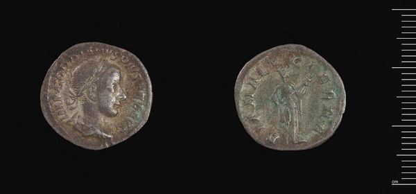 Editor: This is a Denarius of Alexander Severus. It looks small, unassuming. I see the profile of a man on one side, and a standing figure on the other. What can we learn from this tiny coin? Curator: Think about what this coin *did*. It passed from hand to hand, funding daily life but also visually proclaiming the power of the emperor. Consider how images on currency normalize hierarchies. Who is represented, and who is not? Whose power is being amplified? Editor: So, even something as everyday as a coin, becomes a tool for control? Curator: Precisely. By controlling the visual narrative, the emperor controlled, in part, the public perception of his rule. These images reinforced the status quo and suppressed dissenting voices. It's a potent reminder that even the smallest objects can carry significant political weight. Editor: I never thought about it that way before. It makes me wonder about the messages embedded in our own currency today.