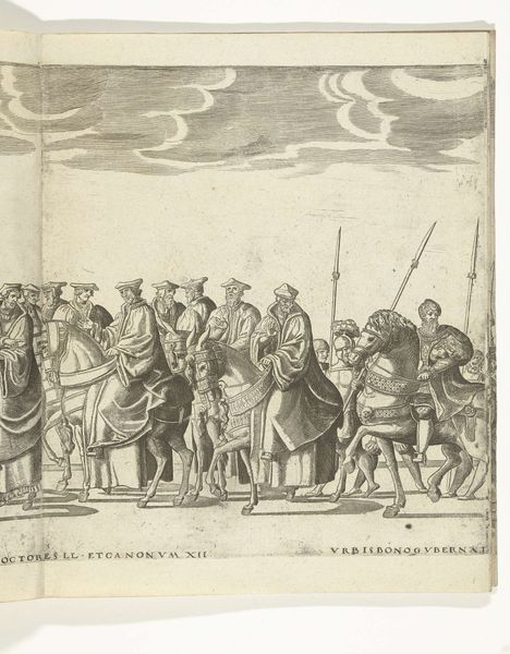 Curator: Wow, there's something intensely...metallic about this print. It's austere, but with hints of ornate grandeur. Editor: Exactly! We are looking at "Bazuinen en landsknechten, plaat 31" which roughly translates to "Trumpets and Landsknecht, plate 31", created by Nicolaas Hogenberg, sometime between 1530 and 1699. It’s a metal engraving, capturing a moment seemingly charged with historical weight. Curator: A procession! Look at the repetition of figures and the horses. There’s a density to the composition; it almost feels claustrophobic. But all of the detail and armor, plumes and instruments hint to me at something quite celebratory at the same time. Editor: Yes, these processions were important in Northern Renaissance art and pageantry, often commemorating military victories or dynastic power. It really speaks to the socio-political theater of the time. Look closer and we see each rider’s gear, they're adorned head to toe. Each piece functions almost like a personal banner or heraldic emblem. Curator: It’s interesting how the artist uses line work to depict textures – the plushness of the plumes versus the cold sheen of the armor. I think it adds so much character. There's also a stark, almost documentary quality, which I find so gripping for some reason. I feel as if I was experiencing this moment myself. Editor: I agree, the dedication to capturing historical dress is important. As prints could be distributed much easier than painted artworks, the role they had in spreading these representations of wealth and power are worth considering too. It seems as if every detail serves a purpose. It’s a complex visual language isn’t it? Curator: Absolutely. Each piece has some element of cultural encoding to communicate prestige. From a modern perspective, viewing this image I suppose might grant insight into how cultural identity has evolved in modern day, as well as revealing the symbols we hold as paramount. Editor: Right, the image acts almost like an archive itself; holding preserved memories that invite the exploration of continuity. Curator: Absolutely! It really invites us to question which legacies we have and, ultimately, will pass on.