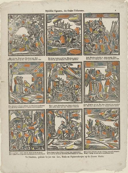 Curator: This print presents “De Fabelen van Esofus,” created between 1739 and 1786. It is an engraving. What are your first thoughts? Editor: Immediately, I notice its connection to folk art, perhaps meant for mass consumption rather than a select audience, almost like a… comic strip? Curator: Precisely! These are indeed arranged much like a comic strip or perhaps more accurately, scenes from a fable. Look at the blocky figures; note how the artist, Jan van Lee, prioritized efficient reproduction using engraving techniques, opting for readily available materials that kept the cost low for widespread circulation. Editor: That production context informs so much. It speaks volumes about the cultural importance of visual storytelling in 18th-century society and who had access to it. These weren't for elite drawing rooms, were they? Curator: Certainly not! The social role of Jan van Lee's print extends into moral instruction through narratives. Given his title "Book and Paper merchant at the Main Market" it seems these inexpensive, rapidly produced images, served as vehicles for imparting communal values. Editor: It also raises questions about how imagery travels and is re-interpreted over time. Does this become incorporated into political discourse or social critique of any kind? Curator: A valid question. Visuals were manipulated to disseminate ideologies throughout that era, so these fables had the capacity to shape moral frameworks. We see how such narratives get embedded within the broader social consciousness through mass media. Editor: Analyzing the context gives us clues as to how such narratives reflect and perhaps perpetuate ideas of social classes and their behaviour during the period. What this piece lacks in finesse, it more than makes up for with historical punch. Curator: Indeed. This unassuming print grants invaluable insight into artistic manufacture and collective interpretation during the Enlightenment, linking these engaging engravings to cultural ideals. Editor: It reminds me that even a relatively modest artwork carries its own profound reflection on cultural influence and artistic worth.