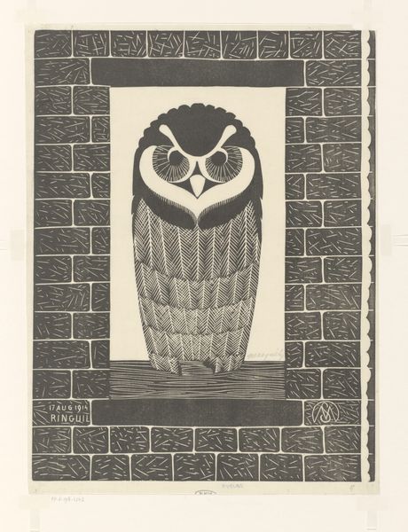 Editor: Here we have Samuel Jessurun de Mesquita's "Hoornuil" from 1915, a woodcut print currently held at the Rijksmuseum. The stark contrast of the black ink on paper gives it a dramatic, almost severe feeling. What kind of presence do you see in this image? Curator: This owl… he is a guardian. Consider the owl's enduring symbolism, deeply rooted in ancient cultures as a messenger of wisdom, a guide through darkness, and a watchful protector. Mesquita's choice of a stark, graphic style intensifies these primal associations. He’s simplified the form, yet captured something essential about the animal’s essence. Editor: So, you see this piece more as a symbol than just a bird on a branch? Curator: Absolutely. The owl's frontal pose, those unwavering eyes… think about what that kind of direct gaze evokes in us. Do you feel observed? Challenged? There is cultural memory embedded in such direct, unblinking observation. And consider this was created in 1915. What else might that fixed stare mean, at that moment in time? Editor: That's true. With the war… that unwavering gaze might represent a watchfulness over Europe. Is that fair to say? Curator: Precisely. An owl’s silence makes him the perfect keeper, don't you think? Now, look closer at the carved lines themselves. Are they uniform? Mechanical? Editor: No, I see variations in line thickness, a definite human touch…a raw quality. Curator: Indeed, each stroke carries intention. This is not a simple depiction. Mesquita channels the weight of ancient knowledge, myth, and a contemporary awareness into this watchful creature. Editor: It really does carry much more depth than I initially perceived. Seeing it as a convergence of cultural memory and a response to its own time is enlightening. Thank you!