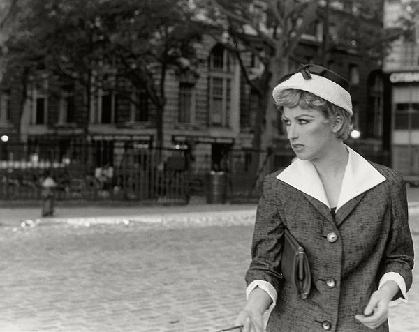 Editor: We're looking at Robert Frank's "At 3:30 Connie goes across the street to Benny's to get some coffee for her boss," a gelatin silver print from 1951. The bustling street scene and the figure of Connie seem almost caught in a moment of quiet contemplation amid the chaos. What stands out to you? Curator: Note how Frank utilizes the stark contrast of light and shadow. The foreground is dominated by the weighty forms of vehicles, creating a strong visual barrier, while Connie is situated within this structured environment. Do you see how Frank employs line and shape to compartmentalize the frame? Editor: I see the way the vehicles sort of frame her, almost like she's navigating an obstacle course. Curator: Precisely. The linear perspective of the buildings receding into the distance is interrupted by the imposing geometry of the trucks. This disruption directs the viewer’s attention back to Connie, a lone figure who anchors the entire picture. Her gesture of looking, seemingly undirected, contributes to a certain level of complexity within an otherwise straight-forward composition. Observe, the visual rhyme created by the rounded forms of the vehicles. Does this affect the overall structure? Editor: It creates a kind of rhythm within the industrial landscape, contrasting with the rigid building facades in the distance. Curator: An astute observation. Frank’s emphasis is on the interplay of form, not necessarily narrative. While we might speculate about Connie’s destination, the photograph’s success resides in its ability to freeze a moment in time, immortalized through formal structures and tonal contrasts. Editor: So, it's less about who Connie *is*, and more about what she *represents* within the overall structure? Curator: In essence, yes. The narrative element serves primarily to initiate an entry into the composition, but the true focus rests on its carefully considered geometry and orchestration of tonal values. A semiotic understanding also provides entrypoints into appreciating the forms and values within the composition, wouldn't you agree? Editor: I hadn’t thought of it that way before, but focusing on the visual structure helps me see past the documentary aspect. Thank you.