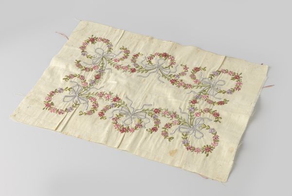 Editor: Here we have a piece titled "Proeflap van kantborduurwerk op machinale tule met een geverderde bloemtak," an anonymous lace embroidery sample from around 1835 to 1845. It’s delicate, almost ghostly. What can you tell me about this textile, looking at it through a historical lens? Curator: Well, looking at the advent of machine-made tulle and embroidered floral motifs, it's indicative of a fascinating shift. It shows the transition from handmade luxury to a potentially more democratized product due to the industrial revolution. Who would have owned this? Editor: I imagine it might be for someone wanting to practice lace-making, but maybe I am wrong? Curator: Perhaps a student or artisan experimenting with new materials and techniques made accessible by the availability of machine-made tulle. What does that say about artistic training at the time? Was it widening? Was lacemaking and decorative embroidery becoming more about industry rather than solely craft and bespoke adornment? Editor: I had not considered the industrial revolution affecting decorative art in that way! What could the floral motif suggest about the role of women in art and society? Curator: Floral motifs were heavily coded. They linked women with nature, beauty, and domesticity. The choice and style of the flower design can carry cultural meanings. Perhaps this pattern sample served more to train a woman in industry work or artistic appreciation rather than just training her for marriageability? Editor: I’m realizing I made a lot of assumptions about women’s training back then. This artwork made me think more deeply about industrialization's impact on art. Curator: And I realized I might have underestimated a lace sample's ability to suggest change and open up new ways for artists.