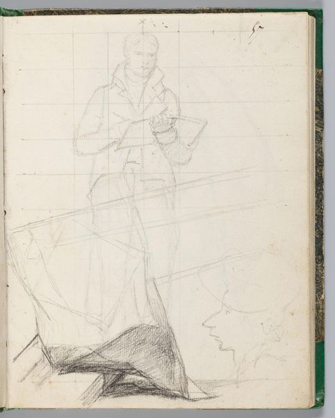 Curator: This is Louis Apol’s “Landschap en een man met bril,” or “Landscape and a Man with Glasses,” likely dating from the 1880s. Editor: It feels like a fleeting observation, a quick sketch captured on the go. There’s a palpable sense of immediacy. Curator: Precisely. Apol was a master of capturing atmospheric conditions and light effects. Look closely at the economy of line. The quick, assured strokes describe both the figure and a suggestion of landscape with minimal effort. Notice the visible grid of the sketchpad paper that the artist purposefully retains. Editor: The man’s slightly slumped posture and intense gaze behind those spectacles hints at intellectual or perhaps artistic fatigue. There’s a vulnerability there. This was drawn amidst growing unrest and socio-economic disparity. Do you think he’s documenting it all, burdened by what he observes? Curator: Intriguing speculation. Semiotically, the figure in spectacles can symbolize insight or scholarly detachment, but I'm hesitant to immediately translate the man’s gaze into social commentary. It might just as easily signal the observational quality fundamental to both art and science. Editor: But we can't divorce art from its historical context. Consider the period: stark contrasts between the emerging wealthy class and the struggling working class, especially in artistic communities. This pensiveness feels like more than mere artistic observation. It has a feeling of moral concern to it. Curator: Regardless, the dynamism in the pencil strokes beautifully constructs not just the form of the man, but also creates a mood of quiet contemplation. Apol uses shading and a clear handling of texture to convey shape. Look at how those short lines, that feel like afterthoughts, construct a very simple environment to support the figure. Editor: So while one might see it as a simply sketched character study, it becomes layered when seen through an empathetic lens – acknowledging how political tension and human fragility might merge within a single portrait. Thank you, Louis Apol, for making us feel as though we are sharing a moment with this intriguing man! Curator: Agreed. It's a striking piece that exemplifies how masterful mark-making alone is powerful, even when devoid of explicit narrative intent.