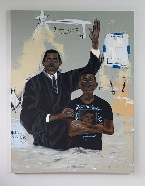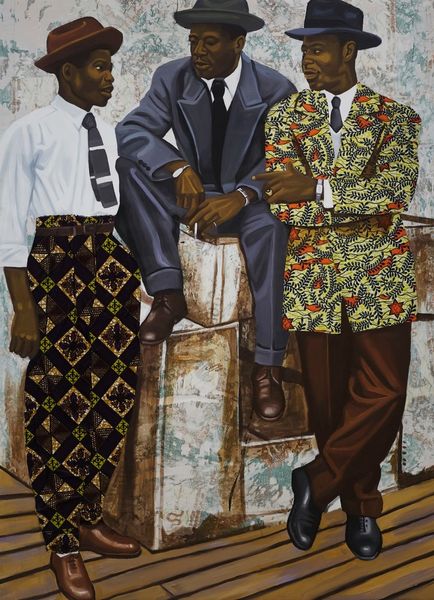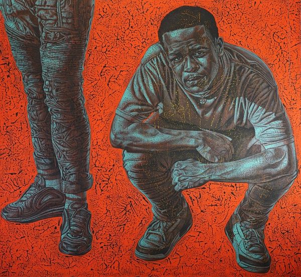 Alfred Conteh created this artwork titled, Faruq and Nasir. The composition is dominated by two figures set against an ochre textured background, their dark skin tones and clothing creating a striking contrast that immediately commands attention. Conteh masterfully employs light and shadow to sculpt form, giving depth to the figures and emphasizing their presence. The texture of the background, with its layers of paint, adds a tactile dimension to the piece. The gaze of the subjects invites introspection and challenges us to reflect on identity, representation, and the gaze itself. By choosing to portray these figures with such intensity and detail, Conteh explores ideas around portraiture and representation, questioning traditional notions of power and visibility. The painting becomes a site where personal and cultural narratives intersect.