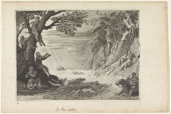 Curator: Welcome! Before us hangs Frederick Bloemaert's "De Maand December," an engraving dating to after 1635, currently held in the Rijksmuseum. Editor: The scene feels desolate. There's a distinct chill in the air, evoked through those barren trees and heavy clouds. It presents such an intimate portrait of rustic life in December, devoid of typical winter holiday celebration. Curator: Bloemaert, although perhaps best known as an etcher, demonstrates here an astute grasp of engraving. The detail achieved—especially in rendering the varied textures of clothing and the nuances of the landscape—speaks to a deeply skilled process. How the lines create depth. Editor: That man precariously perched in the bare tree seems to symbolize the year's end—stripped bare, waiting. The group tending to the ground may signify enduring life sustaining labor and resilience in bleak midwinter. Do you see a connection? Curator: Absolutely. Think about what’s absent: colour. Everything hinges on line and tone, drawing our attention to the physicality of labor and its products. These are ordinary people in the throes of ordinary tasks. It encourages thought around the cyclical patterns that constitute labor and its vital role at the center of our social structure. Editor: But that cyclical aspect suggests hope too, no? The work continues, anticipating the coming spring. There's an implied promise in this dedication, this ritualized task-execution. The dark weather amplifies themes of endurance and silent resolution; a pre-industrial worldview permeates the image. Curator: Well, one could read into the image of those figures drawing material up out of the ground to be symbolic of both agricultural process, sure, but also the ways that materiality is so frequently transformed and consumed for industrial and social reproduction, even then. Editor: So, what lasting significance might Bloemaert seek to impress upon a seventeenth century public by focusing on working people against this cold background? I suspect there might be a political statement latent within this piece concerning shared social duty in December time. Curator: That’s plausible. For me, the enduring resonance of “December” lies in its tangible and exacting demonstration of skill and materiality, its connection to the ordinary but nonetheless critical labour of everyday life. Editor: Yes, there's something universal and very human rendered in this humble little image. The figures are working, of course, to meet life’s material requirements, but Bloemaert's sensitivity endows it with greater cultural significance.