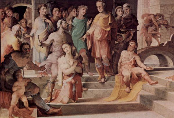 This is Raphael’s cartoon for "The Blinding of Elymas," a tapestry commissioned in the 16th century for the Sistine Chapel. Raphael was a key figure of the High Renaissance, and this work reflects the era’s emphasis on classical themes and humanist values. The tapestry narrates a scene from the Acts of the Apostles. Here, Saint Paul blinds Elymas, a sorcerer, who tried to prevent a Roman proconsul from converting to Christianity. In this moment, you can see how questions of religious authority and cultural conversion were deeply embedded in the political landscape of the time. The tapestry becomes a space where narratives of power, faith, and identity intersect. Its emotional intensity conveys both the triumph of Christianity and the violent suppression of other beliefs, prompting us to consider the complexities of cultural exchange and the imposition of religious ideologies.