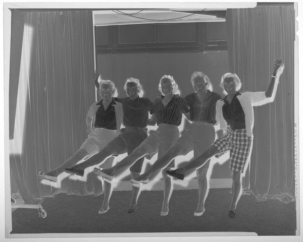 Editor: This is an untitled photograph by Martin Schweig, taken in a living room. The inverted contrast gives it an eerie quality. What do you see when you look at how the children are posed? Curator: The stark inversion compels us to examine the formal elements. The contrast emphasizes the geometric patterns in their clothing and the spherical shapes of the balls, creating a play of light and shadow. Editor: It's interesting how the inversion isolates those shapes. Curator: Indeed. The composition directs our gaze to the interplay between the children and their objects, forcing a consideration of form over content. Notice the vertical lines of the curtains versus the implied movement of the child in mid-air. Editor: I see it now; the stillness of the girl holding the ball is in stark contrast to her active brother! Curator: Precisely. The photograph highlights how form can dictate our interpretation of reality. Editor: It's amazing how much the form changes the feel!