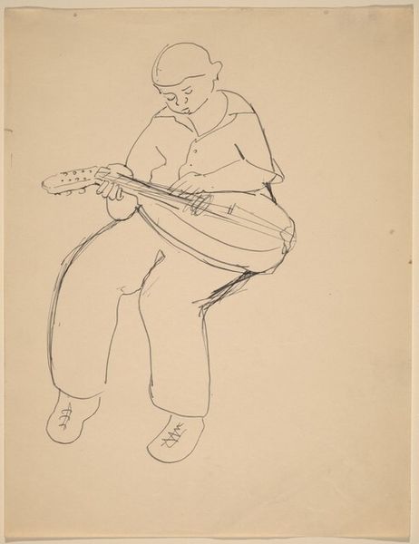 Curator: We’re now looking at “Seated Figure Playing a Lute,” a pencil drawing by Mark Rothko. It’s undated, but it gives us insight into his artistic process. Editor: Immediately, I'm drawn to the vulnerability. The lines are sketchy, tentative almost, and there's a definite sense of intimacy about it. The lute player's pose is introspective, head bowed, seemingly lost in the music. Curator: Well, let's consider the choice of pencil, a humble material. It speaks volumes about accessibility, of art-making not being confined to high-end materials, to a more democratic form of expression. Also the visible crosshatching provides structure and form through repetitive mark-making and careful layering. It allows for modulating of the tonal depth and shadow to create an engaging composition with limited means. Editor: The lute, though. That instrument has such strong connotations! For centuries it symbolized harmony, beauty, and courtly love. Here, with the sitter almost shielding it from view, that potent imagery feels softened and quite personal, turning inward rather than performing for an audience. Curator: That intimacy you noted earlier can be viewed in this light too, perhaps? Rather than Rothko aiming at representation, maybe it’s an early engagement with feeling, conveyed through simple materials. He’s documenting the intersection between person, music, and a quiet moment of labour, that also transcends typical figurative portrayal. The lute being made and its being played. Editor: Exactly. The lute's historical baggage amplifies the quietness, though. A typical performance is about grand gestures, romance, stories from distant lands. Stripping away that context leaves us with just the bare emotional experience and craft. Curator: In summary, it’s quite insightful to regard this figure as evidence of artistic production that predates Rothko’s better-known paintings, speaking volumes on artistic choices from the perspective of material availability and accessibility. Editor: And I will carry with me the image of the solitary lute player. I now see it as a potent reminder of the ability of symbols and their ability to tap into both our collective and highly personal experiences.