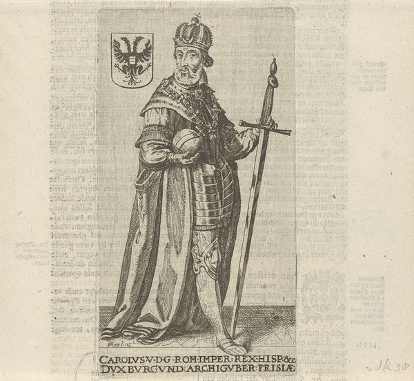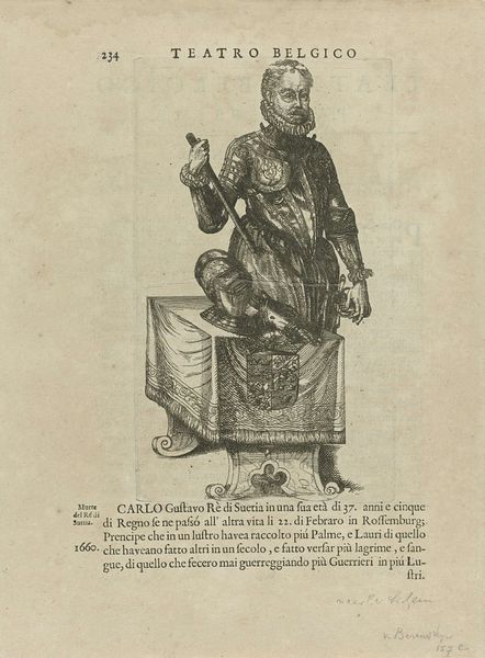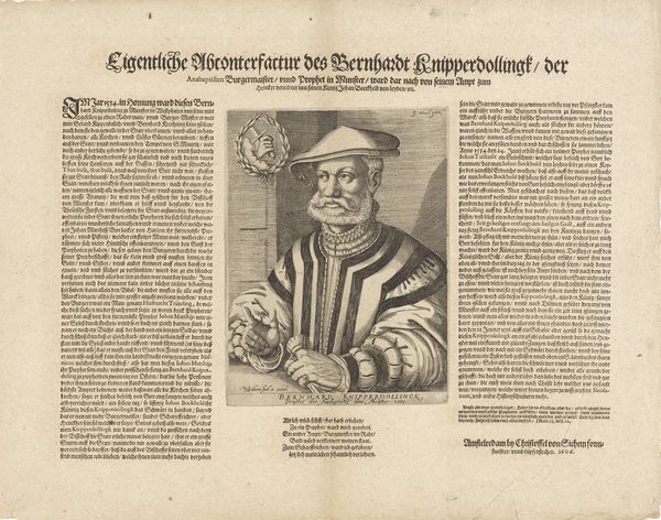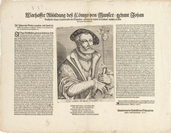 This print, "Portret van Jan Matthijsz," was made by Christoffel van Sichem I in the late 16th or early 17th century. Immediately striking is the stark contrast between the detailed portrait of Jan Matthijsz and the dense, surrounding text. The figure is rendered with meticulous lines, capturing a sense of gravity and presence. The composition is divided, with the subject set against a backdrop that includes a scene of upheaval. A book lies on the table in front of him. The texture, achieved through careful engraving, adds depth to his garments and face, contrasting with the flatness of the printed word. The dominance of text is a crucial formal element. It challenges a purely aesthetic reading, pushing the viewer to consider the historical and ideological context. The combination of image and text invites interpretation, suggesting the subject’s life and times as part of a broader narrative, blurring the line between portraiture and historical document.