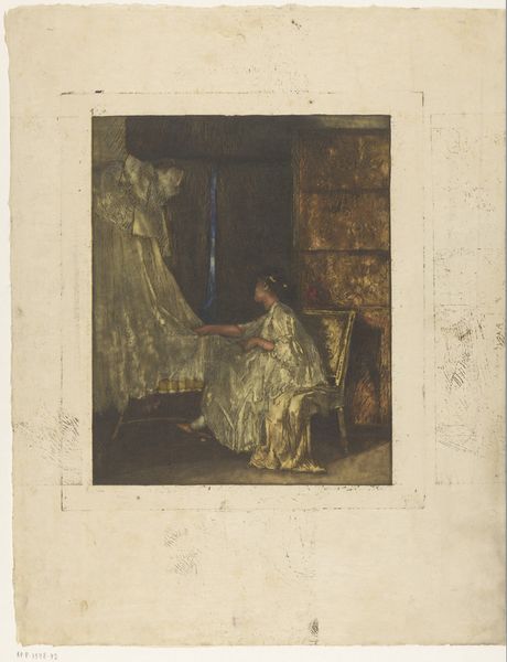 Editor: Here we have "Standing Woman by a Cradle" by Albert Neuhuys, likely created somewhere between 1854 and 1914. It seems to be rendered in watercolor, depicting exactly what the title describes. There's something so tender and intimate about the scene. How do you interpret this work? Curator: This piece provides insight into the social fabric of its time, doesn’t it? Genre paintings like this gained traction for depicting everyday life, often romanticizing the domestic sphere, especially motherhood. Consider how the art market, propelled by a growing middle class, shaped this demand for scenes of familial virtue. The muted tones, almost a melancholic wash, seem to underscore the gravity of the woman's role. How might this image, displayed in a parlor, influence the perception and expectations of women in society? Editor: That’s a really interesting angle. I hadn't thought about how it could shape societal expectations. So, the sentimental portrayal of motherhood might not just be a sweet image, but something with a bit more… weight to it. Curator: Precisely. It's important to consider the intended audience and the potential impact such imagery had on their values and beliefs. Did these depictions truthfully reflect the lived realities of women, or did they offer an idealized—perhaps even prescriptive—view? Are there other images with which we can compare it, perhaps images of working-class families in contrast? Editor: Now that I think about it, there's a vulnerability to it too, because the mother’s social position in that period was not that good, given her dependence. So what appeared like a loving portrait of a mother becomes almost the representation of someone exploited because of her maternity? I hadn’t really considered all of that at first glance. Curator: It’s a subtle, but essential, difference to understand. I think both readings of the image can occur together. What has stuck with you from this exchange? Editor: I'll definitely be paying more attention to the social implications and how these images were intended to be received by audiences back then. Thanks for offering your insight.