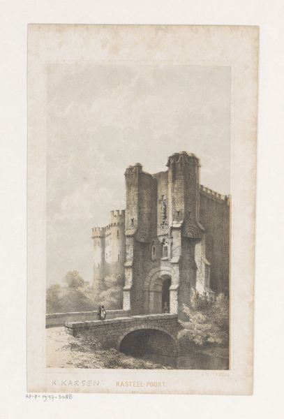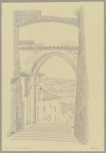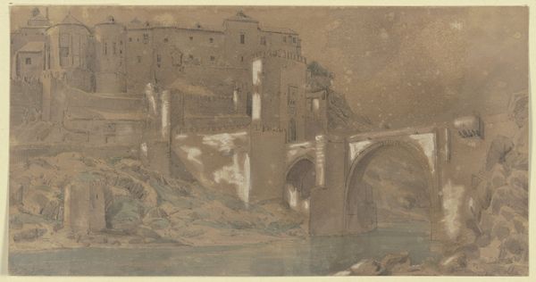 Curator: Bamberger’s “View Through the Arch of a Bridge in Toledo," dating from 1857, offers a glimpse into 19th-century Spain through the lens of Romanticism, rendered in delicate watercolor and colored pencil. What do you make of it initially? Editor: Wow, it’s all dreamy blues and greys, isn't it? It looks like a faded memory, a hazy recollection of something grand. There’s something both majestic and melancholic about it. Curator: That's a fitting sentiment. Bamberger, working en plein air, captured not just the topographical details of Toledo but also the prevailing Romantic sensibilities that connected to longing for the past, the sublime, and the beauty found in nature, and architectural ruins, here seen almost as a theatrical backdrop to a scene playing out somewhere beyond the artist's vantage. Editor: The archway totally frames the distant cityscape, almost like a stage curtain pulled back to reveal…well, another crumbling set, haha! It gives you this weird sense of distance. It feels very quiet, solitary. Was he trying to capture something about the impermanence of things, the way even cities crumble, empires fade? Curator: Absolutely. We must consider how Spain held significance in European imagination. Often framed by orientalist gazes, here we have an artist using landscape as a way to discuss notions of national identity and historical power through the artistic trends of the period, perhaps subconsciously commenting on social or political situations back home. The use of watercolor softens what would otherwise be an extremely rigid structure, which for me invites reflections on control, legacy, and representation of the foreign and "other." Editor: I love the ambiguity in the wash, actually. You can see every little pencil mark, so it really holds you. If it was too perfect, it’d lose its soul somehow. I think that imperfection makes the romantic element sing in this one. The quiet and the slightly crumbling quality creates something beautiful. Curator: A wonderful observation. It prompts me to reconsider the relationship between historical representation and individual interpretation. What initially seems like a picturesque scene of architectural romanticism, on closer examination becomes a thoughtful portrayal reflecting power dynamics through Bambergers careful choice of perspective, capturing Spain from afar. Editor: I completely agree! Maybe that distance is what invites a closer and longer consideration of its significance. There’s so much depth—both artistically and metaphorically. I’m certainly seeing it differently now!