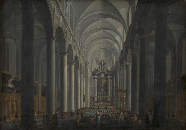 Editor: David Roberts' "Chancel of the Collegiate Church of St Paul, at Antwerp" portrays an awe-inspiring interior. The verticality and light remind me of a spiritual awakening. What do you see in this piece? Curator: Light becomes a symbolic language here. Notice how it sculpts the statues and altar, imbuing them with a sacred aura. How does this interplay of light and shadow resonate with you on a symbolic level? Editor: It feels like a revelation, a glimpse into another world. The artist uses light to create a sense of divine presence within the church. Curator: Precisely. The architecture itself is a symbol of aspiration, reaching towards the heavens. Roberts isn't just painting a church; he's capturing the essence of faith. Editor: I never thought about it that way, but seeing how symbols of faith create cultural memory does add depth. Curator: Indeed. By understanding these symbols, we unlock a deeper appreciation for both art and cultural history.