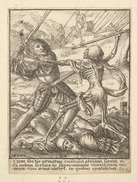 Jacob Binck made this engraving, "Death and the Foot Soldier," in the 16th century, during the Northern Renaissance. It stages an encounter between a soldier in elaborate armor, and the grim figure of death. The image is an allegory, a visual representation of abstract ideas. Here, death reminds us of the fleeting nature of life. The hourglass in the bottom corner makes this message even clearer. The soldier represents earthly power, wealth, and the pride of life, but death reminds us that these things are temporary. Such imagery, made in Germanic lands, often spoke to the social anxieties of the time. Religious wars, plagues, and famines were common, and this awareness of mortality pervaded the culture. Artists like Binck made prints that served as "memento mori," reminders to contemplate mortality. The image can be understood better by viewing it in the context of the history of printmaking, social history, and the history of medicine.