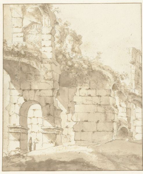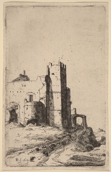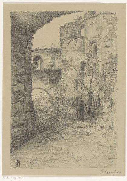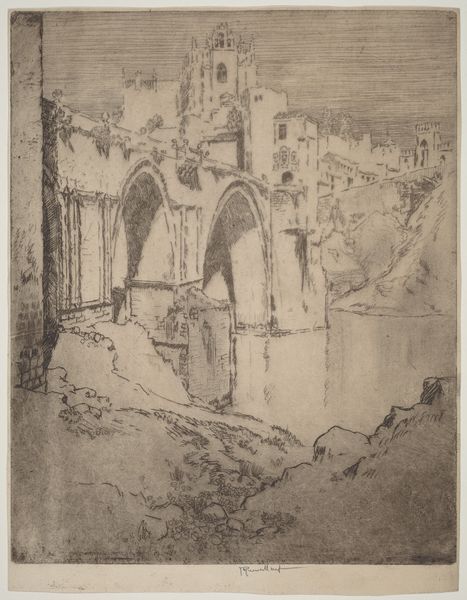 Curator: Isn't this ink drawing by Fernand Combes marvelous? He calls it "Sospel, Le Pont Vigie," created back in 1925. I find the way he's built up texture with those tiny lines so captivating. Editor: Absolutely. There's something haunting about it, isn't there? Like looking at a memory slowly fading. All those stones sketched in painstaking detail; it feels weighty, historical. A sentinel. Curator: It's fascinating to consider Combes's perspective. Working during the interwar period, cityscapes like this became popular ways of showing how places held on to the past even as the world raced towards modernity. Sospel is this little town in the south of France that felt forgotten, even then. Editor: It certainly does capture a sense of forgotten history. I keep getting pulled back to the viewpoint - this weird sort of voyeuristic angle, as if the artist is in the structure itself looking outward. It is definitely an intimate glimpse. How might viewers in 1925, living through all of that political and social instability, engage with an image that makes this forgotten-ness the entire focus? Curator: I see that tension too. These structures embody both refuge and exposure. I wonder, given the pen and ink medium, and the relatively small scale, was Combes intending for this work to have any real public-facing message? It feels to me like something much more personal, less about Sospel and more about Combes himself. The details—every brick, every roof tile rendered with such care. Editor: It is a fascinating question. What I do know is that throughout history, representations of monuments have been carefully constructed tools of state. Was this bridge just some architectural object for him? I would doubt it. The very act of isolating it this way gives the bridge monument status. Curator: Maybe the point is, the past isn't really dead, it’s actually still everywhere, informing the present whether we acknowledge it or not. What do you think, can the monumentality still work if it feels almost... private? Editor: I think that private aspect might be precisely where its power lies. Combes captures the anxiety of living among the ruins of prior generations, something that always seems deeply relatable across many different times. Curator: Yes, the fragility of memory, maybe, captured in ink. Thanks for helping me see this in a new light! Editor: Always a pleasure! This really emphasizes the ability of drawings to show us some complex sides of familiar places.