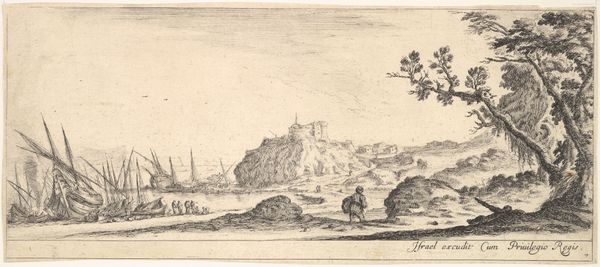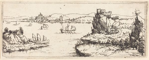 Editor: This is "River Landscape with a Rider on the Bank," a pen, ink, and etching piece by Bonaventura Peeters I, created sometime between 1624 and 1652. The detailed linework really captures the stillness of the water and the busyness of the scene. What strikes you about this artwork? Curator: Considering this work through a materialist lens, I see an etching made accessible through printmaking. The materials -- ink, paper, etching tools -- and the labour invested reveal the intention to distribute imagery. Notice the scene isn’t of nobility; it shows merchants or common people utilizing the river for transport and trade. How does the proliferation of prints like this challenge traditional notions of artistic value? Editor: That's fascinating! I hadn’t considered the "accessibility" aspect. So, you are saying this etching challenges the idea of unique artworks intended solely for the elite? Curator: Precisely. This becomes a commodity. The act of creation itself, the labour, the access to materials, all point to a shift in the art world. We move away from solely celebrating unique works and examine the socio-economic implications of artistic reproduction. What kind of markets do you think are built because of art forms like these? Editor: It suggests a growing market for art among the merchant class. Maybe even a budding art market influencing tastes beyond the traditional aristocratic circles? Curator: Exactly. It points to a world where art becomes intertwined with trade, accessibility, and broader societal consumption. And through the production, distribution, and consumption of material, art becomes entangled with wider economic forces. This is precisely why thinking critically about artistic process is very insightful. Editor: I see your point! Looking at art with production and materials in mind provides such an enriched viewpoint. Thanks for shedding light on that. Curator: And thank you. Exploring it together is what enlivens art history!