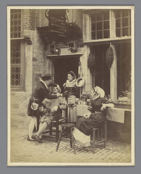 This monochromatic photograph depicts a barber shop for beards in old Antwerp, showcased at the World Exhibition of 1894. The composition, divided into distinct planes, invites us to consider the interplay between public performance and intimate care. The photograph frames a scene where the act of grooming becomes a spectacle, challenging the boundaries of personal and communal space. The structure is organized to draw the eye from left to right in layers, following the narrative of the shaving. The textures, captured with remarkable detail, emphasize a world where even mundane activities are imbued with performative elements. The framing and textures aren't simply representational, they engage with larger questions about the commodification and spectacle of everyday life in the context of global exhibitions. It reminds us that photographs like these don't passively reflect reality, but actively construct meaning through framing, composition, and texture.