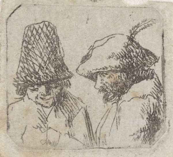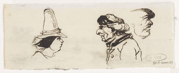Editor: Wow, look at this sketchy little gem. There’s something so immediate about it; like the artist dashed it off in a cafe while eavesdropping on someone's juicy conversation. Curator: Indeed. What strikes me most about Johannes Tavenraat’s "Vrouw met muts, in Lübeck," thought to be from around 1869 and held at the Rijksmuseum, is how it captures a certain mood despite its unfinished quality. Editor: The hats! They’re practically characters themselves, aren't they? Like spun sugar or maybe architectural models…they definitely have attitude! Curator: They signify social status, definitely. The city of Lubeck at this time had specific cultural norms related to dress. The rapid strokes, that energetic ink hatching, though, hints at a tension between social identity and individual expression. Consider what was acceptable for women’s representation at the time and how it speaks, perhaps, to repressed freedom. Editor: Ooh, repressed freedom! I love it! The faces almost disappear under the shadows, but their absence kinda gives them power, makes them less...available for consumption. It is fascinating that Tavenraat used only ink for this piece. Curator: It limits tonal range and thus makes the sketching and rapidness feel even more impressive, I think. This study uses the city as more than just the location of a society, but, perhaps as a character or concept as well, representative of the woman and how that concept is received in that time. Editor: I dig it! It's not just about portraying someone, but about saying something about a system, and I like how the raw feel contrasts with the sophistication suggested by those mad hats. Curator: Agreed. Tavenraat delivers a powerful, multilayered experience here. Editor: Right? Makes me wanna go sketch people with hats! You know, grab some coffee, observe and then maybe set fire to expectations about those people!