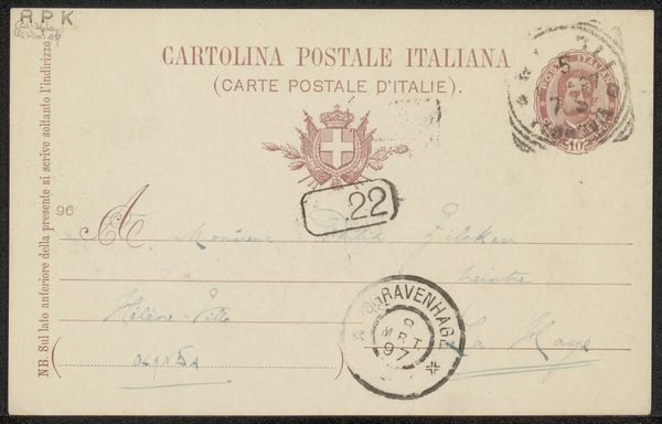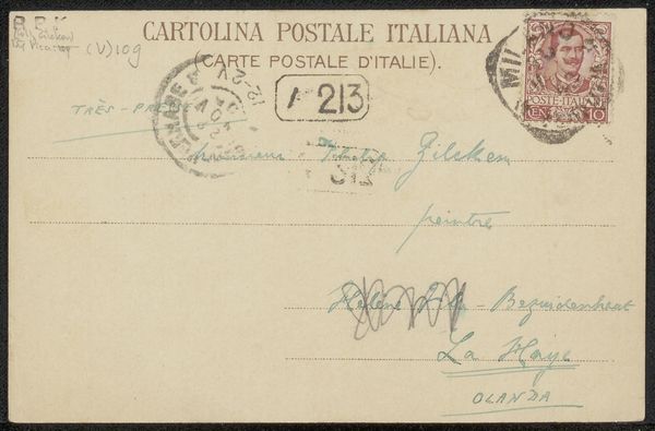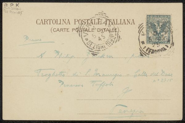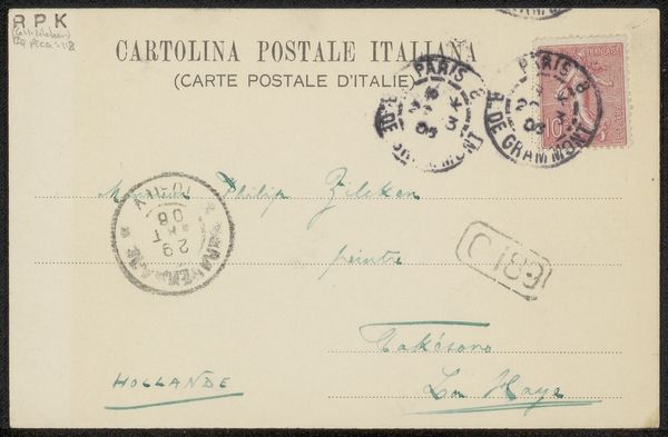 Curator: Here, we're looking at a fascinating artifact: "Briefkaart aan Philip Zilcken," likely from 1906. It’s ink on paper—a humble postcard, really—but loaded with secrets. Editor: My first thought? Intimacy. It’s so personal, seeing someone’s handwriting, their choice of stationery. It’s like peering into a private moment frozen in time. Curator: Precisely. The formal elements are intriguing too. Notice the economy of line. Each word, each address scrawled with purpose—a direct route to connection. Editor: And the faded inks! That soft grey and sea green whisper tales of journeys and touches across the ages. What can you tell about the person? Curator: The script has character and grace—literate but hurried. See the way the salutation curves and dips. We might infer a certain familiarity with the recipient, Philip Zilcken. Also the use of multiple languages--a cultured correspondent? Editor: It feels almost ephemeral—the ghost of communication. It would make anyone question our dependence on cold emails these days. Where’s the romance and tactility? Curator: You can almost see the hand hovering, making quick decisions. The postmark—a smudge of grey, but visible enough—locates it. It feels both precious and immediate, as if a portal into this historical exchange. The Italian designation on top-- *Cartolina Postale Italiana*. There's so much we still don’t know for sure, though. Editor: The slight imperfections—the blurred stamp, smudged address and stamp– are a beautiful counterpoint to modern slickness, too. It reminds us of process, the tangible act of sending a message. A perfect paradox between a planned artifact and pure spontaneity. Curator: It is truly. A reminder that even the most modest artifacts can offer profound insights. A small slip of paper holds big stories.