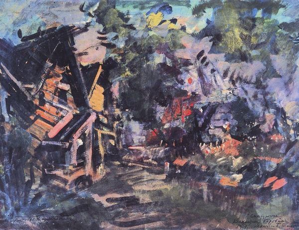 Curator: Here we have "Cell," painted by Konstantin Alexeevich Korovin in 1912. The work, rendered in oil paint, captures a forest landscape in an impressionistic style. Editor: Oh, wow. I'm immediately struck by the density of it all. It feels almost claustrophobic. Like the trees are pressing in, you know? Curator: Precisely. It's interesting how Korovin uses these rough brush strokes to evoke a feeling of being enveloped by the woods. Consider also how the landscape genre gains an elevated position by the means of oil on canvas, a material usually deployed for more noble subject matters like portraits and historic sceneries. Editor: Yeah, the impasto creates this really tactile sense of the bark and foliage, and this dark and light play. You feel the artist worked this up rather quickly, but with intense awareness. And that little spark of light back there, could it be the promise of exiting the woods, the promise of clarity? Curator: I am glad that you picked on this small area where light shines: It suggests how Korovin subverts traditional landscape painting to reflect modern urban anxiety in Tsarist Russia, an unstable political era shortly before World War I. The work reflects how rural landscapes offered respite for many urban residents who suffered social unrest and alienation. Editor: Right, like he's not just painting pretty trees; he is rather suggesting a search for solace. It makes you think about our own relationship with nature, or even how fleeting any safe and comfortable haven is. Curator: In essence, "Cell" embodies the political role that the Russian landscape occupied. Editor: Well, looking at it now, I get that the canvas mirrors how we ourselves search for calm. It makes me feel seen, you know?