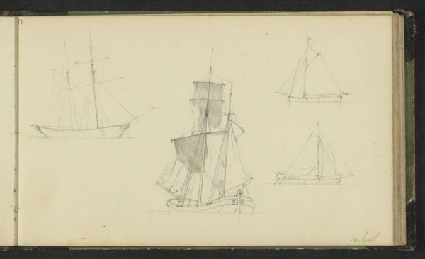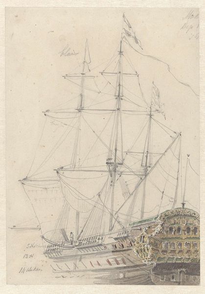 Editor: We are looking at "Bark aan een kade," or "Bark on a Quay," a pencil drawing on paper by Hendrik Abraham Klinkhamer from around 1843 or 1844. There's a serene, almost melancholy feel to it. The ship, rendered with such precise lines, appears still, almost ghostlike, against the pale paper. What do you see in this piece? Curator: Beyond its apparent realism, I see a powerful statement about the social and political landscape of the time. Consider the Romanticism movement's fascination with nature, but also its tendency to idealize the past. This ship, frozen in time, represents not just a vessel but also the complex entanglement of trade, colonialism, and the exploitation of both human and natural resources. Editor: Could you elaborate on the "exploitation" aspect? I hadn't considered that. Curator: Certainly. These ships weren't merely vehicles of commerce; they were instruments of imperial power. They facilitated the transportation of goods, yes, but also the subjugation of populations and the extraction of wealth from colonized lands. This seemingly peaceful image, therefore, carries a weighty historical burden. We need to ask ourselves whose stories are not being told here. Editor: So, the artist might be unintentionally highlighting those power dynamics, even while focusing on the aesthetic of the ship itself? Curator: Precisely! And even the seemingly neutral style of Realism contributes to this. By presenting the ship in such a straightforward manner, Klinkhamer perhaps inadvertently normalizes the systems of power it represents. This raises crucial questions about representation, complicity, and the role of the artist in society. Do you see it now? Editor: Yes, absolutely. It completely shifts my perspective. I initially saw only a beautiful drawing, but now I see it as a document implicated in complex social and economic systems. Curator: That’s the power of engaging with art through a critical lens. It challenges us to look beyond the surface and interrogate the deeper structures at play. Editor: Thank you; I will never look at a maritime scene in quite the same way!
