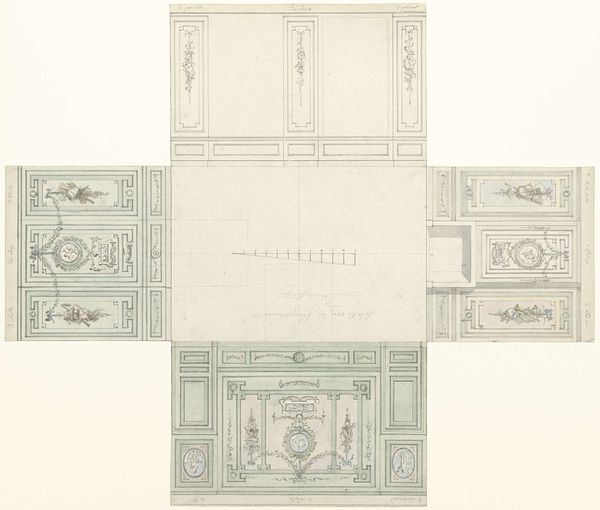 Curator: Looking at this delicate design, it almost feels like stepping into a dream, or maybe a stage set for a Mozart opera. The neoclassical precision makes me imagine powdered wigs and hushed conversations behind silk fans! Editor: Exactly. What we’re seeing here is Jurriaan Andriessen's "Ontwerp voor behangschildering," a design for a wall panel dating back to the late 18th century. It's ink and watercolor on paper and showcases a vision of domestic space deeply enmeshed with social and political meanings of that period. Curator: Late 1700s… That's when everything was supposed to be simple and elegant again after all that Baroque flamboyance, right? All clean lines, right angles, those stylized classical columns. Although, simple might be too strong of a word, considering that mantlepiece… Editor: There’s nothing “simple” about social control or power structures, which is often exactly what neoclassical designs reinforced. Note the rigid symmetry and how it attempts to evoke a sense of order and rationality. But who really benefited from this "order"? Curator: I see your point. Although it looks calm, serene almost, perhaps that impression of control can feel a little…oppressive, in a way? Editor: Think of it as a carefully constructed facade, mirroring the social hierarchies of the time. A room like this wouldn't just be for living; it would be a performance space where identities were meticulously presented and maintained, and inequalities perpetuated. Curator: Well, now I can’t unsee it! Still, there's a certain wistfulness about the drawing itself, a feeling of "what if?" The washes of watercolor, the fragility of the ink lines, it all suggests a beauty that's almost ephemeral. Editor: I agree. Perhaps it’s that tension - between the rigidity of the form and the fragility of its rendering – that speaks to us today. We appreciate its aesthetic qualities but must recognize that its design served as a quiet backdrop for maintaining an exclusive, unequal social world.