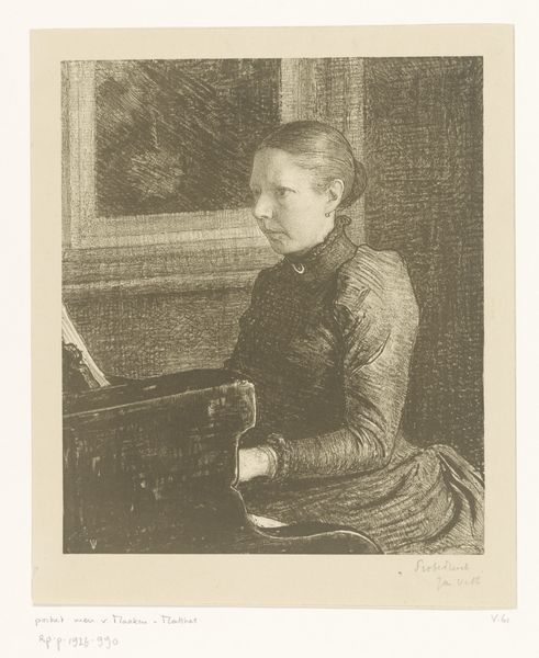 This is Bramine Hubrecht’s “Pianospelend Meisje”, made with etching. The immediate impression is one of intimacy, achieved through a tonal range of blacks and grays. The subject is captured in profile; she is cropped closely and set slightly off-center in the frame. Hubrecht has chosen a moment of intense concentration. The girl's gaze is fixed downward toward her hands. The artist’s formal decision to obscure the girl’s eyes creates an ambiguity. We, the viewers, can only guess at what she might be thinking and feeling. The composition creates a spatial compression which is further emphasized through the use of hatching to define tonal variations. The vertical lines formed by the window in the background act as a structural element of the composition, reinforcing a sense of enclosure. Ultimately, the power of this etching resides in its ability to evoke a mood that is both tender and subtly melancholic, asking us to consider the silent inner world of its subject.