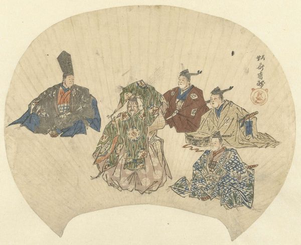 Curator: The first thing I see in this print is stillness, despite the swords and elaborate costuming. The overall tone feels restrained, almost contemplative. What’s your take? Editor: You've picked up on the nuance immediately. We're looking at Tsukioka Kôgyo's woodblock print, "Masataka, from the series Pictures of No Performances (Nogaku Zue)", created in 1898. This artwork resides at The Art Institute of Chicago, and as the title suggests, it’s derived from the visual lexicon of Noh theatre. Curator: Ah, Noh theatre – that makes sense. The stylized gestures and the deliberate pacing…it’s all there, isn't it? But thinking of this as a woodblock, what about its production draws your attention? Editor: Absolutely. The meticulous carving required for the robes alone. Look at the repetition of those geometric patterns, contrasting with the delicate gradation of color in the white garments. It’s a collision of precise craft and almost ethereal representation, creating a really rich tension. I can imagine this was laborious work by numerous craftsmen. Curator: Exactly! This isn't just Kôgyo; we’re seeing the cumulative skill of block carvers and printers. The choice of paper itself speaks volumes, informing how the inks absorb, giving the print its aged softness. Consider too, this piece as part of a series - these prints become a method of cultural documentation and, arguably, preservation of the tradition of Noh at a key cultural moment of modernization. Editor: A cultural archive, presented beautifully. It's interesting how the lack of a strong narrative invites a more internal, reflective experience for the viewer. I find myself constructing a story within this stillness. Curator: That resonates. It’s less about the depicted performance and more about the potential of it; an exercise in expectation, and also the material qualities. Editor: Well, that’s offered an alternative perspective, hasn't it? Something silent and yet clamoring.