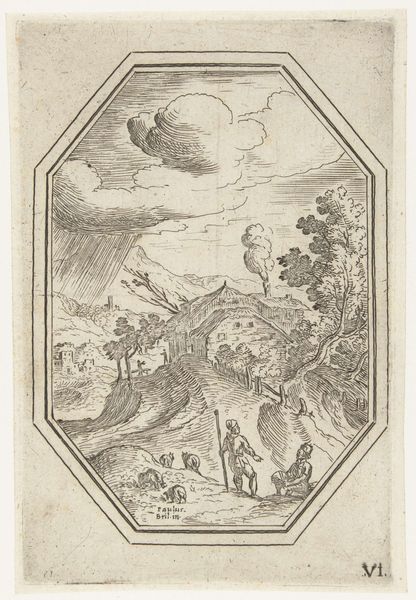 Curator: Holbein the Younger's woodcut print, Ex. XXXIV, presents a biblical scene with a distinct graphic clarity. Editor: The density of line work used to create the figure of Moses on the mount is striking, especially given its means of production. I wonder about the tools involved. Curator: The composition neatly divides the earthly and divine realms, doesn't it? Moses kneels with the tablets as the Almighty appears above in a cloud. Editor: I'm drawn to the repetitive mark-making in the tents. It feels almost mass-produced, which brings to mind ideas about labor and craft during the time. Curator: Observe how the black and white contrast emphasizes both the divine light and the weight of Moses' task. The formal balance reinforces the significance. Editor: The texture of the paper itself seems crucial—almost like a geological stratum mirroring the landscape depicted. It underscores the art's physicality. Curator: Indeed. It serves as a powerful visual signifier of divine law and human responsibility. Editor: Thinking about the printmaking process adds another dimension to its meaning. Curator: Precisely. Editor: Fascinating, thank you.