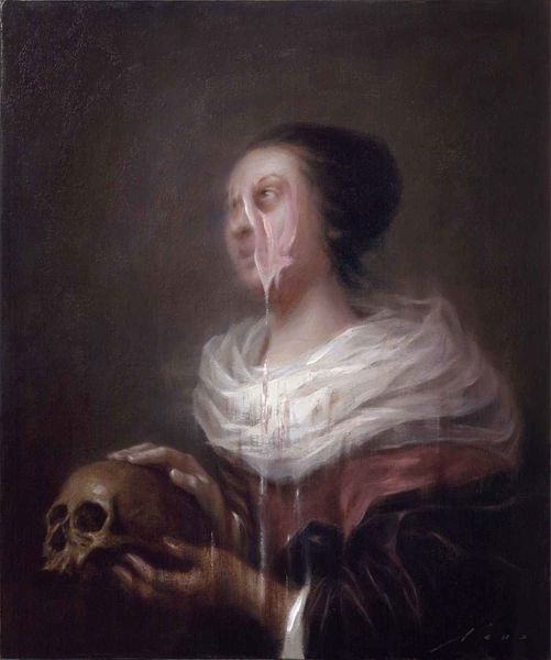 Curator: Jan Cossiers painted this "Penitent Magdalene" around 1624. The piece invites contemplation on mortality and redemption, common themes in Baroque art. Editor: My initial response is one of somber beauty. The soft lighting contrasting with the darkness accentuates the subject's delicate features and the stark presence of the skull. Curator: Indeed. Cossiers created this in a time of Counter-Reformation. Images like this encouraged reflection, and demonstrated the Catholic Church's emphasis on penitence and forgiveness. Magdalene here symbolizes repentance. Editor: Notice the contrast between the woman’s soft skin and the roughness of her garments— the delicate handling of light also reinforces that contrast, creating depth. Then there's the texture of the skull. It serves as more than a memento mori, it almost possesses character in its own right. Curator: It is meant to be unsettling. Magdalene, frequently depicted as beautiful and wealthy, here rejects earthly pleasures, signified by her state of undress, embracing a spiritual life. Editor: It’s masterfully staged! The gaze directed away pulls the viewer in. Her gesture is equally telling; is that a gentle caress, or a moment of profound realization touching the hard surface of death? The earth tones lend a sense of austerity appropriate to the scene, further anchoring it. Curator: Exactly, it makes a powerful statement when placed in its historical context. This image would have urged the audience to examine their lives and seek divine pardon in a world undergoing religious transformation. The subject’s quiet resolve and devotion speaks volumes. Editor: The way Cossiers arranged the planes—her face, the hand, and skull—form a subtly tilted composition, drawing the eye into that central triangle, compelling a visceral response from the viewer. Curator: Precisely, that's the intent behind such works of religious art. Editor: I see how context deepens the artistic impact. Curator: Absolutely, but let’s acknowledge the compelling power of the composition and lighting too. Together they explain the historical pull of "Penitent Magdalene".