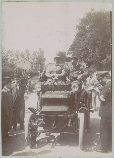 Editor: This photograph, taken in 1898, captures participants in the Paris-Amsterdam race, possibly near Nijmegen. It's a gelatin-silver print held at the Rijksmuseum. It feels incredibly staged, like they’re posing with their new toy, not actually racing. What strikes you most about this piece? Curator: Well, it's a fascinating snapshot of technological optimism and emerging social rituals. Consider the context: automobiles were novelties, expensive status symbols. This image isn't just about the race, it's about the performance of wealth and modernity. Look at the subjects' clothing. How does it inform the relationship between technology and society at the time? Editor: Their clothes are definitely formal! Top hats and jackets… a bit much for a race, right? They look more like they’re off to the opera. Is the act of photographing influencing how they behaved? Curator: Precisely. Photography here is serving a very public role. It's documenting and, more importantly, *legitimizing* this new form of transportation and its wealthy proponents. The automobile, through images like this, becomes part of the accepted social fabric. It signifies progress, linking its owners to a specific socio-economic class. Do you see a sense of speed, or something else being expressed? Editor: Not really speed; they seem rooted in that exact moment. I hadn't thought about it that way, but the photograph definitely elevates the car and the people in it. Curator: Exactly. And notice the crowds in the background – a captivated audience to this spectacle. This photo helped popularize cars and legitimized what they represented. We still see those themes playing out today with our relationships to new technology. Editor: I see your point. This image is as much about selling a dream as it is about documenting a race. Curator: Indeed. It really shows how art reflects and shapes societal values, not just depicts them. Thanks for bringing your insights today! Editor: Thank you! This makes me look at older photographs in a new way.