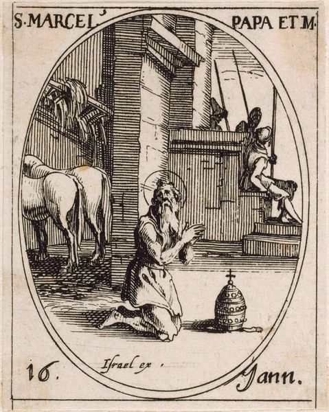 Editor: This is Jacques Callot’s “Saint Columba,” a small engraving. There's such starkness to the image. What's happening with the saint and that bear? Curator: The chained Saint Columba, also known as Colombe of Sens, stands between a bear and a child. The bear, a common symbol of untamed nature, kneels submissively, a testament to Columba’s spiritual power. Editor: So the bear represents something tamed? Curator: Precisely. It's a visual language reflecting her triumph over earthly instincts, a symbolic representation of faith overcoming adversity. Consider how such images reinforced societal values at the time. Editor: It's amazing how much cultural weight a simple image can carry! Curator: Indeed, it reveals a continuity of symbols through time.