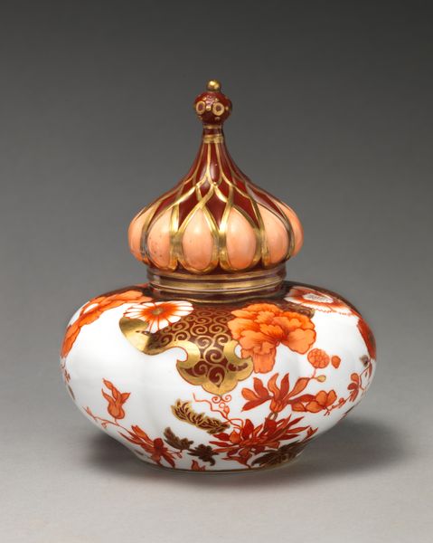 Editor: Here we have an 1884 porcelain vase by Crown Derby, currently residing in the Metropolitan Museum of Art. The floral motifs are just beautiful. All those layers make it seem almost jewel-encrusted! What can you tell me about its production? Curator: The vase screams materiality. Notice the intricate labor involved. Porcelain itself—a carefully crafted material requiring specialized skills and technology of firing, and glazing. Consider what that labor means during the industrial revolution of the 19th Century. Editor: It definitely looks incredibly time-consuming and meticulous. But why so much gold? Curator: Precisely! Think of gold, not just as decoration, but as a material expression of wealth and power. The burgeoning middle class sought such displays of opulence, blurring the line between art and craft, because there was mass-production here and high craftsmanship applied simultaneously. Were pieces like these aimed at expressing personal taste or at accumulating social capital? Editor: So it's both beautiful and a status symbol, right? How was Crown Derby able to manufacture them on a large scale while preserving those highly elaborate decorations? Curator: That tension is key. The production lines might be somewhat systematized for the sake of business but a highly-skilled craftsperson decorated each and every of them individually and they took pride in doing so, the individuality made the pieces stand out, it seems. Are those techniques celebrated today, or are these now deemed "low" art? Editor: I never considered how something could be so beautiful and still caught up in these sorts of historical material conflicts. That is definitely something that will change how I approach objects from now on. Curator: Yes, indeed. Looking through this material lens we started to see an object transformed from an aesthetic jewel to a complex cultural document.