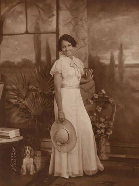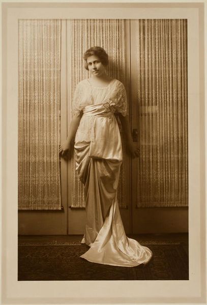 Curator: Martin Schweig created this photograph titled "Mrs. R. C. Sutton." The dimensions are roughly 26 by 20 centimeters. Editor: It has such a serene, almost melancholic quality, doesn't it? The muted tones emphasize the texture of her dress and the play of light. Curator: The dress itself is interesting. The composition, with its pleats and soft sleeves, draws the eye, creating a beautiful contrast. I also love the balance between the subject and the patterned backdrop. Editor: I am drawn to the symbolism of the floral curtain, a domestic scene. It speaks to the traditional role of women, but also hints at an inner life and the beauty of the natural world. Curator: The photographer's choice to frame Mrs. Sutton sitting and not standing creates a sense of intimacy. It is quite a classic portraiture approach. Editor: The gaze of Mrs. Sutton is direct, almost challenging. She seems self-possessed despite being captured within a very conventional composition for her time. Curator: I find myself focusing on the geometric pattern of the floor, which juxtaposes sharply against the softness of Mrs. Sutton’s features. That contrast really energizes the piece. Editor: It gives a good sense of the era's aesthetic, doesn't it? A blend of formality and understated elegance. Curator: Precisely. It's a fascinating convergence of structure and expression. Editor: A truly evocative image, offering so much to ponder.