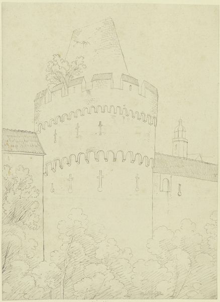 Editor: This is Johann Friedrich Hoff’s "Roter Turm mit Faultor in Wertheim..." created around 1860. The work is rendered in ink on paper. I’m really drawn to the delicate line work. What’s most striking to you about its formal qualities? Curator: Immediately, I observe the artist's skillful use of linear perspective and tonal gradation to create depth. Note how the verticality of the towers is contrasted with the recession of the archway. What impact does this deliberate structure achieve, do you think? Editor: I suppose it emphasizes the height of the structures, and the gate seems to draw you into the unknown, while the towers are permanent fixtures of this landscape. The shading is minimal, making it appear timeless. Curator: Precisely. The controlled application of ink wash defines volume and texture and guides the eye through distinct compositional zones. It may be helpful to explore the function of the negative space in your analysis, or how the contrast between line and shadow affect your reading of this historical painting. Editor: I see that the artist doesn't include any stark colors; it allows you to see only shapes and the subject’s texture as it relates to surrounding objects, which highlights how even objects are deeply connected in real life and spatially dependent on their relationships. Curator: A rather profound assessment, however I question its broader implications in the present moment. Consider then, how does the drawing use basic forms, verticality, and perspective to achieve visual harmony? Editor: The basic geometric forms, the ink line variation, and soft gray gradations result in an amazing level of spatial awareness in an early cityscape landscape. The composition really directs your eye! Thanks! Curator: A rewarding examination! Our scrutiny here reinforces the understanding that artistic intention and careful structural arrangement contribute significantly to the artwork's expressive capacity.