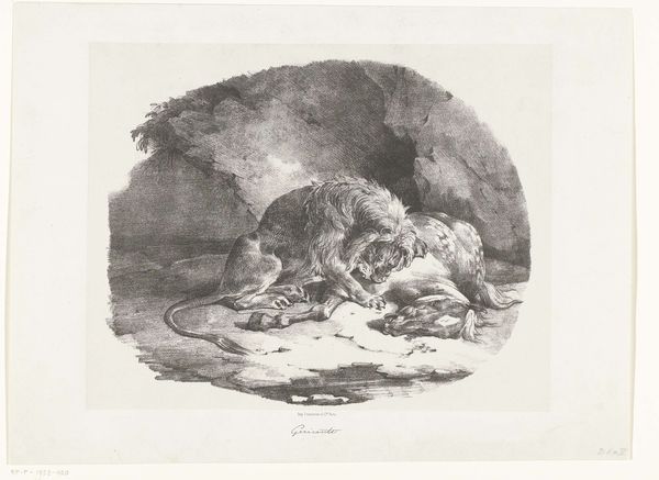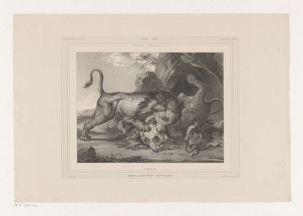 Editor: Here we have William Walker’s “Drie Spelende Leeuwen,” or “Three Lions at Play,” from 1769. It's an engraving. What I find immediately striking is the dramatic use of light and shadow - it feels almost theatrical, like a stage set for these powerful animals. What do you see in this piece, especially given its historical context? Curator: It's important to remember that images like this played a vital role in shaping public perception of the natural world. This print dates from the late 18th century, when scientific illustration and artistic representation were often intertwined. The lion, a traditional symbol of power and majesty, is here domesticated, rendered as a subject for polite contemplation, even entertainment. Does this domesticated representation influence its majesty? Editor: That's interesting - a kind of visual "taming" of nature for a European audience. It’s quite different from how lions might have been perceived in other cultures. Were prints like this common? Curator: Mass-produced engravings were crucial in disseminating knowledge and cultural values at the time. This piece suggests an era grappling with how to classify and present the animal kingdom to the European public. What power dynamics can you read in such image making? Editor: So, it's not just a depiction of lions; it’s also reflecting broader social and political ideas about control and the relationship between humans and the wild. I guess these depictions have shaped our understanding about these animals. Curator: Exactly. Images like Walker’s were integral to forming those perceptions. The popularity of such works reinforced a specific view of the world. Editor: This has been really eye-opening; I’ll definitely look at similar animal depictions with a more critical lens now. Curator: Excellent. It's about understanding the politics inherent in what seems like simple representation.