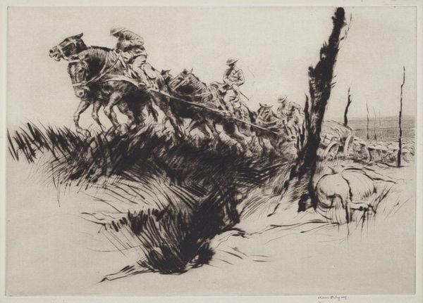 Arthur Briscoe made this etching, "Abandoned," showing a ship and polar bears using a process of scratching lines into a metal plate. The whole scene is rendered in a kind of grey, built up from hatched lines. Briscoe's lines have this fantastic quality – they're not just describing, they're also creating a mood. Look at the way he suggests the water. It’s like the sea is made of tiny, nervous strokes, giving the impression of constant movement, and danger. And then, those bears! They are so solid, but made of the same tentative marks. Think of someone like Rembrandt, how he used etching to explore light and shadow, but Briscoe brings in a kind of storytelling, maybe like Winslow Homer. There’s a bleakness here, but also a strange beauty in this silent encounter, this drama of survival. It’s about the push and pull of nature, and the marks that somehow bring it all to life.