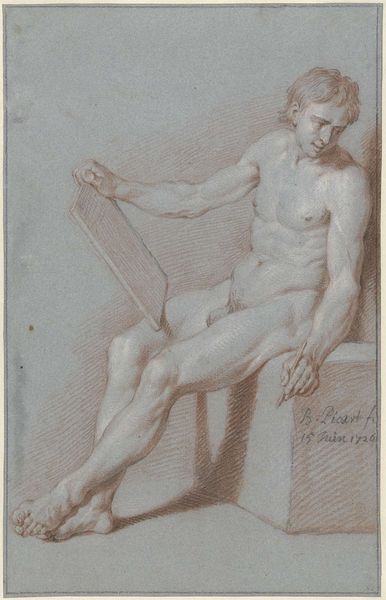 Editor: Here we have Gerardus de San jr.’s "Zittend mannelijk naakt," created in 1806 using charcoal. I'm struck by the tension in the figure, the way the lines of his body contrast with the rigidity of the cubes he sits on. How do you interpret this work through a formalist lens? Curator: Well, observe first the composition. The artist utilizes a monochromatic palette, compelling us to consider the modulation of tone and shadow to articulate form. What role do you believe the chiaroscuro plays here? Editor: It emphasizes the musculature, creating a dramatic contrast between light and dark that defines the figure’s strength, wouldn’t you agree? Curator: Precisely. And notice the geometric underpinnings. The cubic forms anchor the figure, creating a visual structure. Does the figure’s pose reiterate or disrupt that sense of order? Editor: I’d argue it disrupts it. The man’s diagonal pose and pointing gesture create dynamism, preventing the piece from becoming static. There's an interesting push and pull between the organic form and the geometric shapes. Curator: An astute observation. The success of the piece relies on the artist’s capacity to imbue those formal relationships with expressive potential, while respecting the stylistic and philosophical constraints of Neoclassicism. Have your perspectives shifted on this drawing? Editor: Absolutely. I see now how the artist manipulates line, light, and form to construct meaning and tension beyond the literal depiction of a nude figure. Thank you for showing me how to interpret it beyond the historical and the cultural contexts. Curator: Indeed. Understanding how formal elements interact is crucial to unpacking the depth and intention within any artwork.