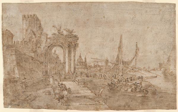 Editor: This is Hubert Robert's "A Roman Capriccio," made around 1763-1764. It’s rendered in pen and ink. It has a dreamlike quality to me, a collection of monumental architectural forms. What do you see in this piece? Curator: I see the 18th century fascination with antiquity filtered through the lens of power. These “capriccios” weren't meant as accurate records, but rather as theatrical displays of reconstructed grandeur. Notice how Robert mixes Roman ruins with Egyptian pyramids and obelisks, almost as a stage set. Who, do you think, was consuming such imagery at the time? Editor: I suppose it would be wealthy Europeans on the Grand Tour? Curator: Precisely. This wasn’t just about admiring the past, but possessing it vicariously. Images like these were commodities, symbols of status, feeding into a burgeoning art market catering to elite desires. They reflect the cultural appropriation and even the seeds of colonialism disguised as aesthetic appreciation. Consider, how might Robert's placement and scale choices impact the viewer's understanding? Editor: The massive scale suggests the power of these empires, and I guess how little the everyday people mattered in the big scheme of it all? I never considered the social impact of just drawing architecture. Curator: Indeed. The layering of historical periods, the romantic decay juxtaposed with imposing structures - it’s a visual narrative about legacy, empire, and, ultimately, who controls the telling of that story. These drawings highlight not just Robert's artistry, but the power dynamics inherent in art production and consumption. Editor: I always saw these scenes as pretty and fantastical. It’s amazing how much context shifts my understanding of it all. Curator: It’s in understanding that context that the true beauty of art lies.