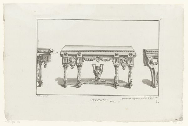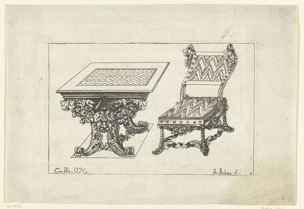 Editor: This is “Tafel,” a pre-1685 engraving by Johannes Indau. It's quite striking in its detail, even though it's just a simple line drawing of a table. The elaborate legs really grab my attention. How do you interpret this work? Curator: This table, etched with such meticulous detail, speaks volumes beyond its practical function. Consider the Baroque period, a time of opulence and dramatic flair. What do the swirling acanthus leaves adorning the legs suggest to you? Think about the cultural memory embedded in these forms. Editor: A sense of grandeur, definitely. The leaves feel almost alive, like the table is growing. Curator: Precisely! And what about the checkerboard pattern on the tabletop? Does that evoke any specific games or activities for you? Perhaps it speaks to strategy, leisure, or even social standing. Editor: Chess, maybe? Or checkers? It feels very deliberate. Games for nobles. Curator: Exactly. Beyond recreation, such games symbolized intellect and strategic thinking – qualities admired by the elite. This table isn’t just furniture; it’s a stage for displaying status and cultural refinement. What do you take away from understanding the context of the era? Editor: I hadn’t thought about it that way before. Seeing it as more than just a table, but a representation of an entire social class, really makes it come alive. Curator: It is rewarding when these objects can be vessels of cultural continuity and meaning. Now it also symbolizes the present, as we examine it and question it! Editor: That’s definitely given me a new perspective on engravings. Thank you!