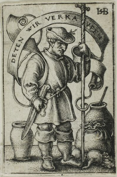 This print, *Peasant in Slashed Clothes*, was made in 1587 by an anonymous artist. It’s an engraving, meaning the image was incised into a metal plate, likely copper, with a tool called a burin. Ink was then applied to the plate, forced into the grooves, and the surface wiped clean before printing. Look closely and you’ll see how the material influences the artwork. The sharp, precise lines are a direct result of the engraving process. This technique allowed the artist to create intricate details and textures, from the peasant's slashed clothing to the landscape beneath his feet. The act of engraving itself is labor-intensive, reflecting the social context of the time. Prints like these were relatively accessible, allowing for wider dissemination of images and ideas. The choice to depict a peasant, and his defiant statement in the script, adds another layer of meaning. This print blurs the lines between high art and popular culture.